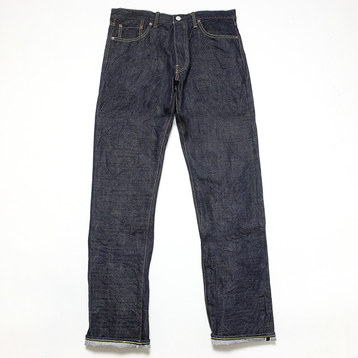 定番ロングセラーモデル。縦糸に6.8番手のムラ糸を使用し、力職機(シャトル織機)でヴィンテージの風合いを追求して織り上げたデニム。米国産100%スーピマ綿糸をタテ糸、ヨコ糸ともに打ち込み、ローテンションで織り上げることで表面の凹凸感を生み出しています。100%ピュアインディゴのロープ染色は、ダブルダイする事により、特濃色のデニムに仕上げています。防縮、ねじれ加工をあえて施さず、ヴィンテージデニム本来の雰囲気を生かしました。シルエットはやや細身のストレートモデル。